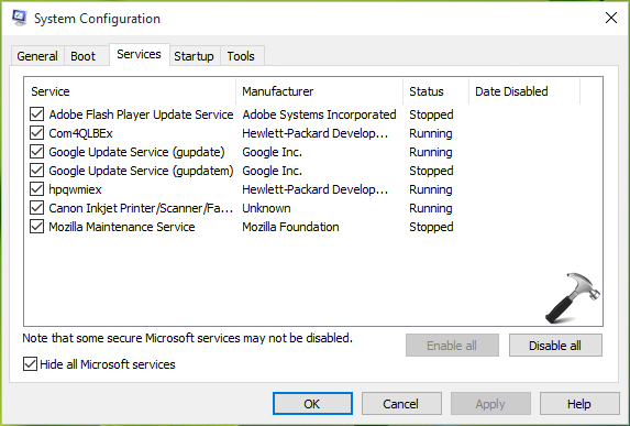 Csak fussmsconfigparancsot, lépjen a Szolgáltatások fülre, és ellenőrizzeAz összes Microsoft szolgáltatás elrejtésemajd ütniAz összes letiltásagomb.