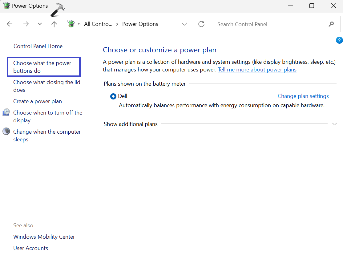 2. Kattintson a „Válassza ki, mit csinál a bekapcsoló gomb”Opció a bal oldali panelen.