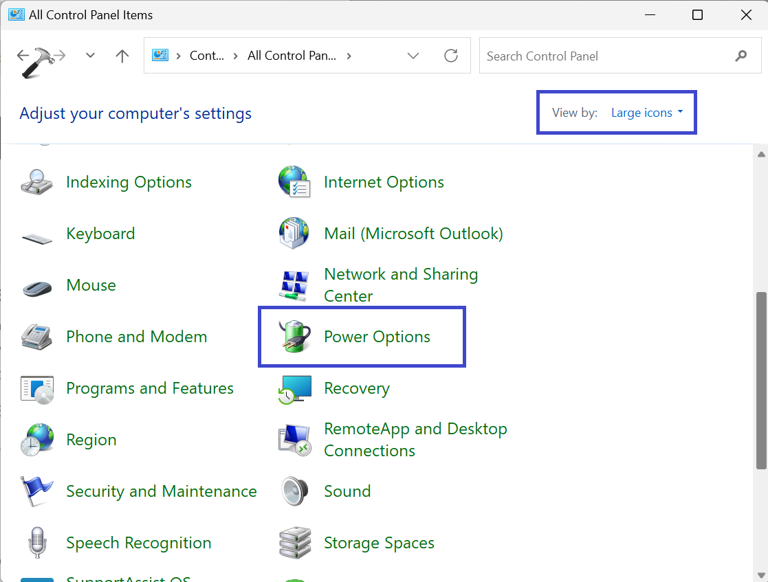 1. Nyissa meg a kezelőpanelt, és állítsa be a kilátást a „Nagy ikonok„.Energiaellátási lehetőségek„.