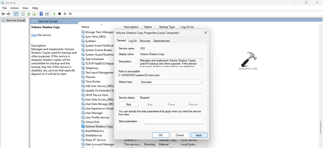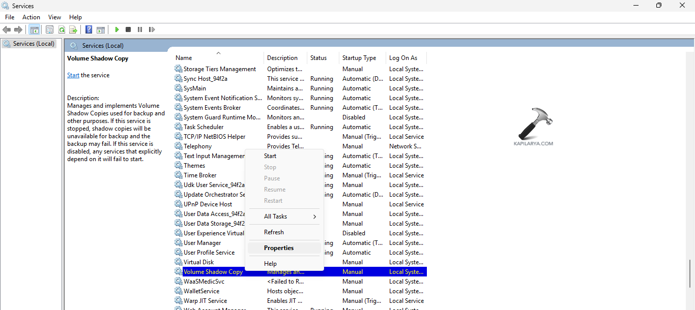 A Volume Shadow Copy szolgáltatás, ha a fogyatékkal élők is, akkor a problémát is okozhatják. Ezért biztosítani kell, hogy a szolgáltatás engedélyezve legyen. Kövesse a lépéseket, hogy ugyanezt tegye.