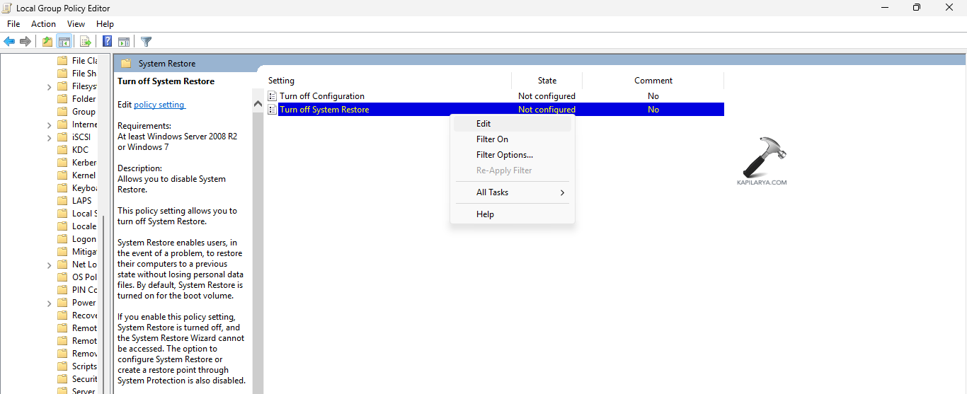 4. lépés-Most kattintson a jobb gombbal Kapcsolja ki a rendszer visszaállítását, és válassza a Szerkesztés lehetőséget.
