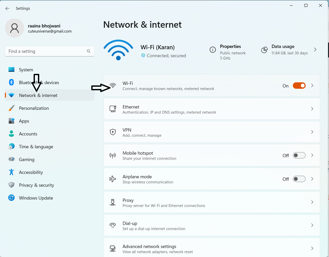 1. Lépjen a Start menü> Beállítások> Hálózat és internet> WiFi elemre.