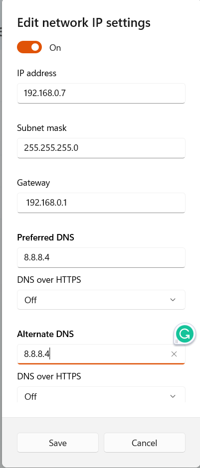 9. Hasonlóképpen, másolja az alhálózat, az átjáró, az előnyben részesített DNS és a váltakozó DNS -t a parancssorból, és illessze be őket az ablakban megadott mezőkbe. Kattintson a Mentés gombra.