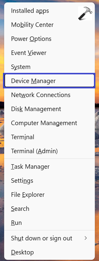 1: Nyomja meg a Windows gombot + X gombot, és válassza a “Eszközkezelő„.