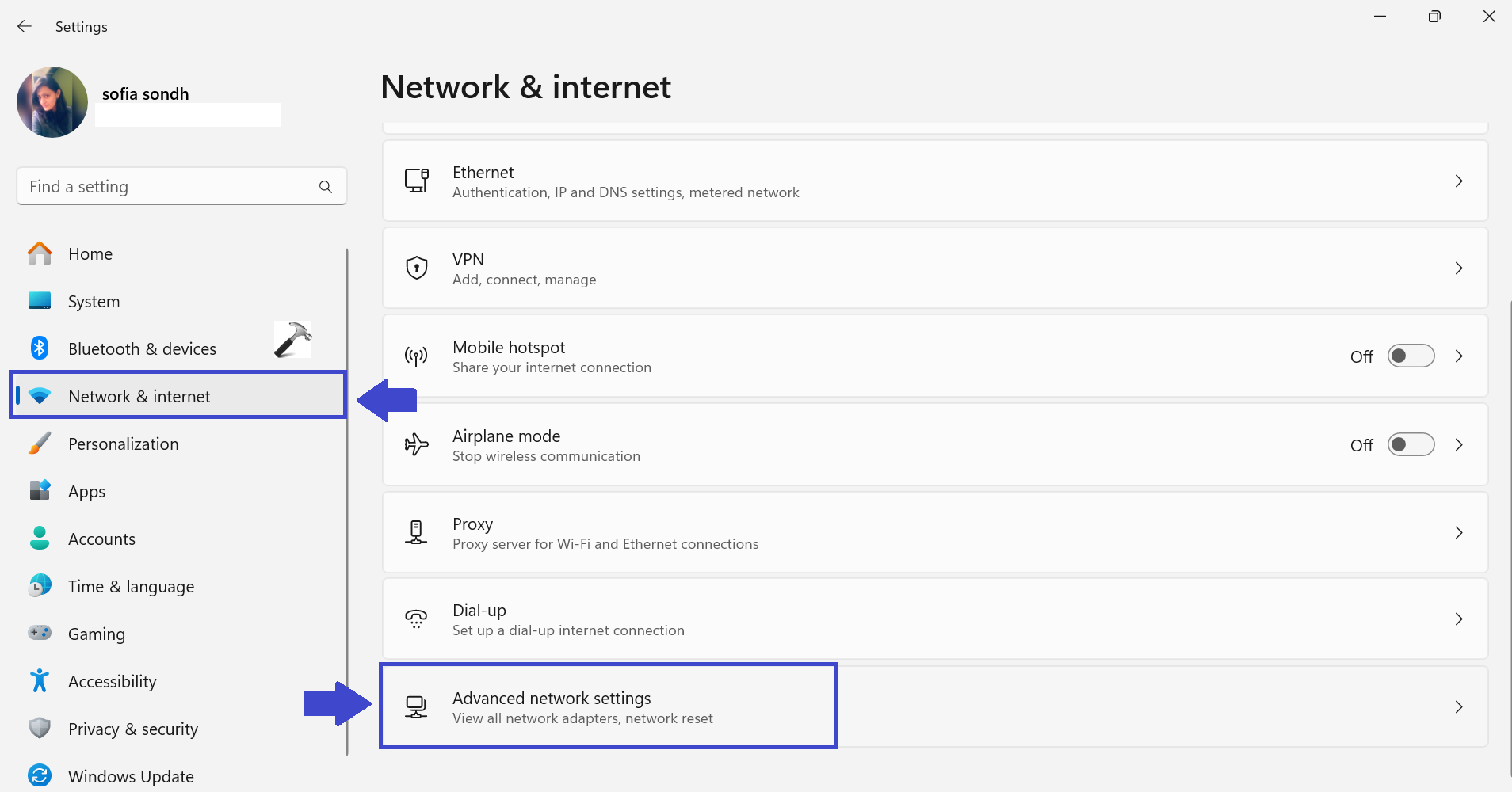 2: Menj a “Hálózat és internet"És válassza a"Speciális hálózati beállítások„.