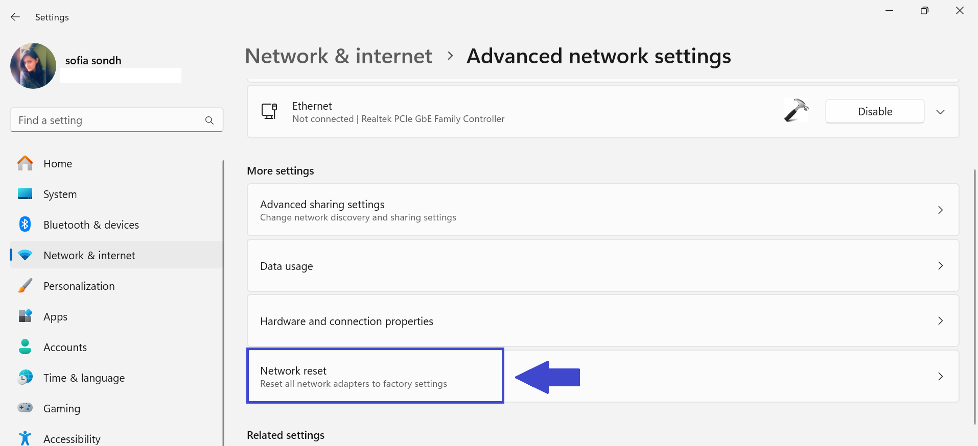 3: A “További beállítások", Kattintson a"Hálózat visszaállítása„.