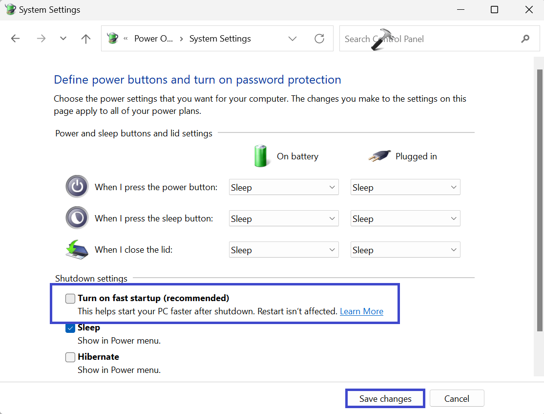 5. Törölje a jelölést a „Kapcsolja be a gyors indítást (ajánlott)”Opció, majd kattintson az„ S ”elemreAve változások„.