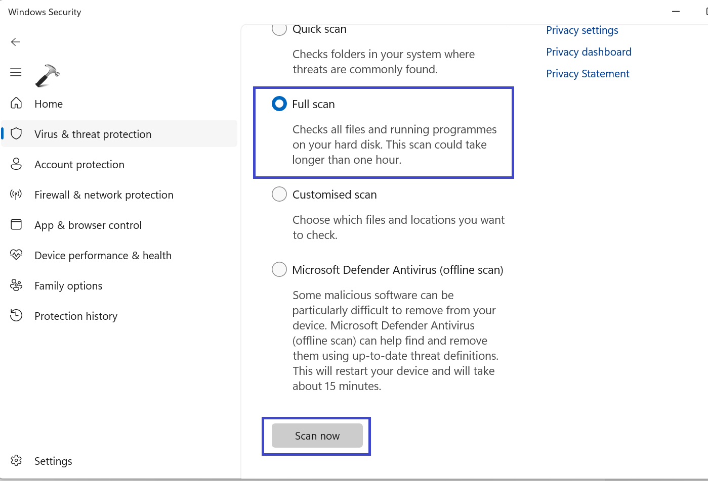 5. Itt válassza ki a „Teljes beolvasás”Opció, majd kattintson a“Szkenneljen most„.