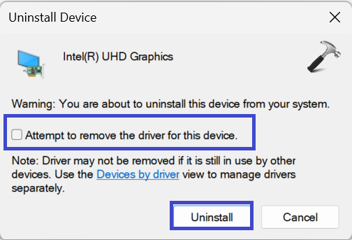 Ellenőrizze a „Próbálja meg eltávolítani az eszköz illesztőprogramját- Box, majd kattintson a “Eltávolít„.