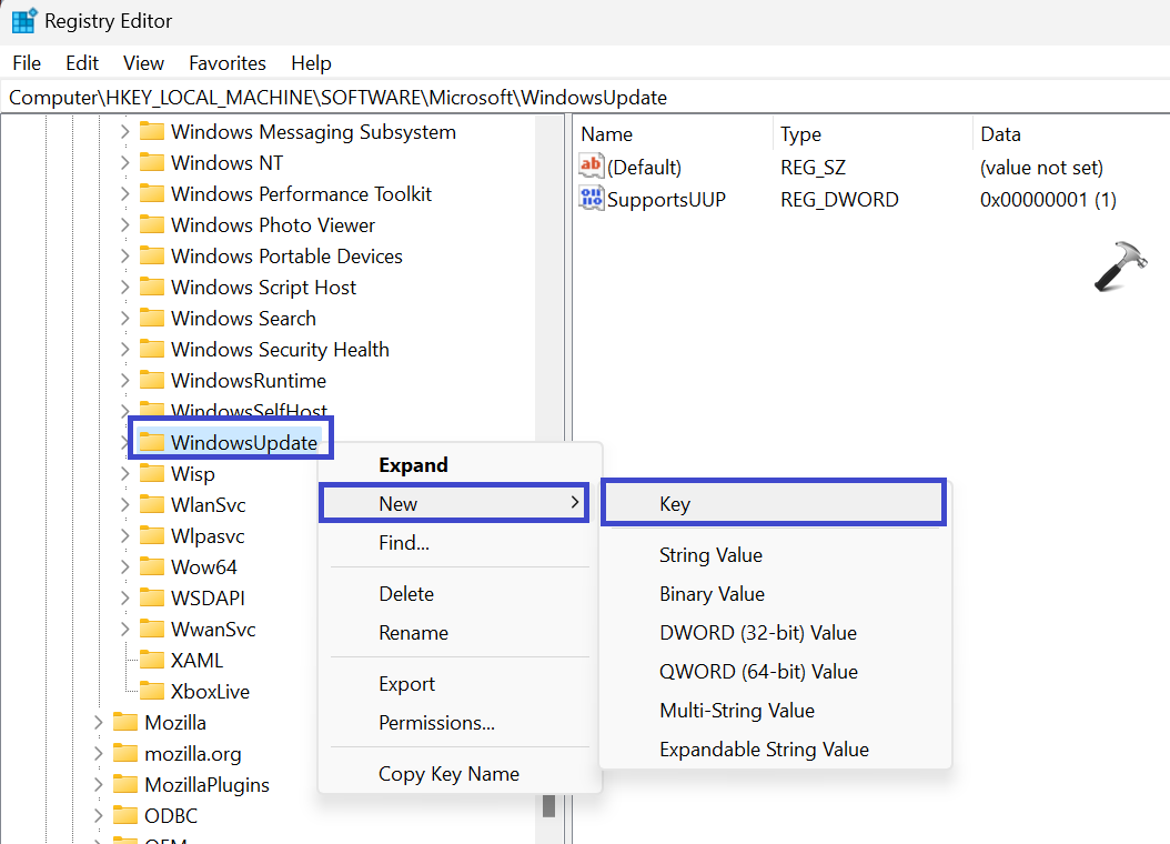 3. Most létrehoznia kell a „Windows frissítés ”kulcsfontosságú.