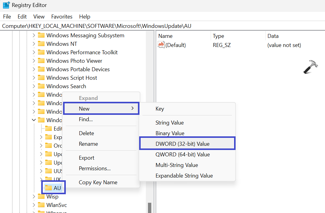 5. Kattintson a jobb gombbal a „Au„Kulcs és válassza a„Új => DWORD (32 bites) érték„.