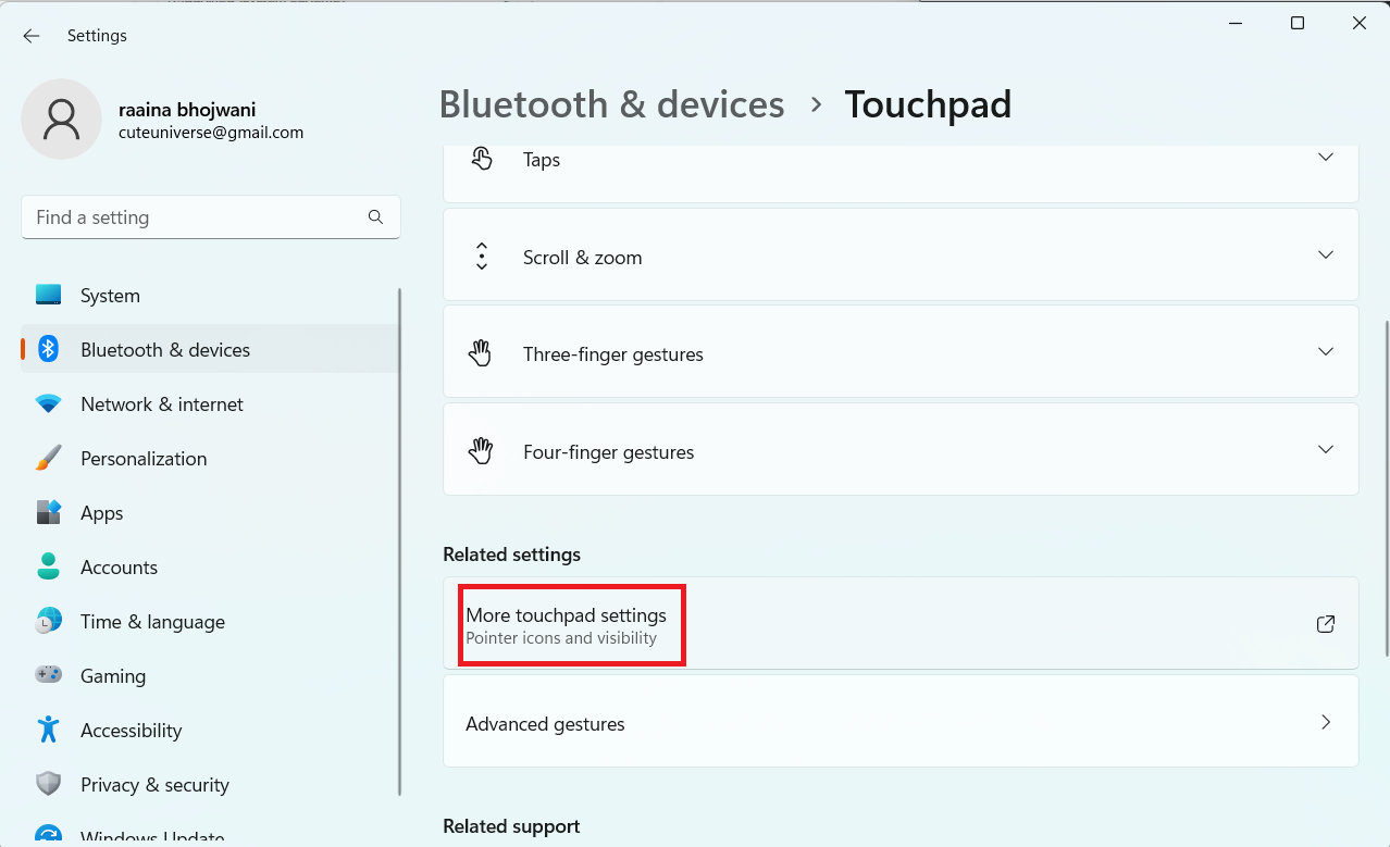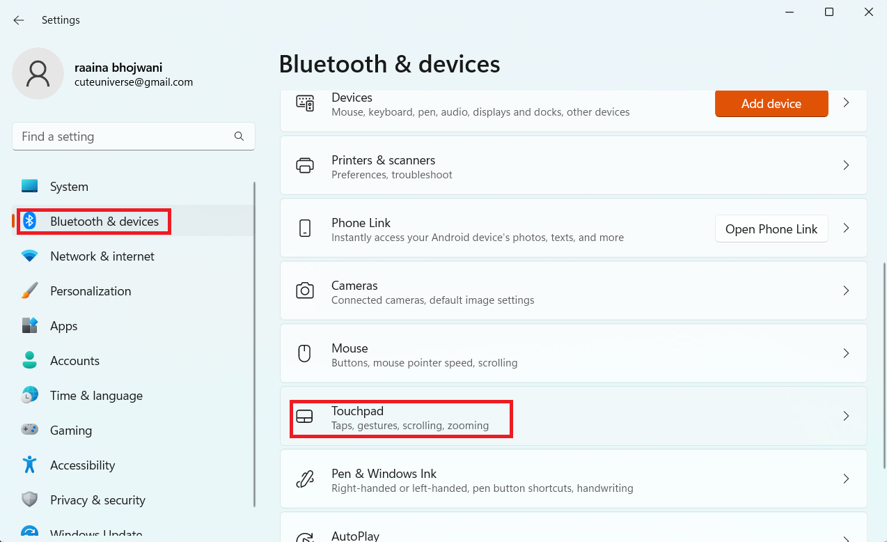 2. Kattintson a „Bluetooth és eszközök” > „Érintőpad” elemre.