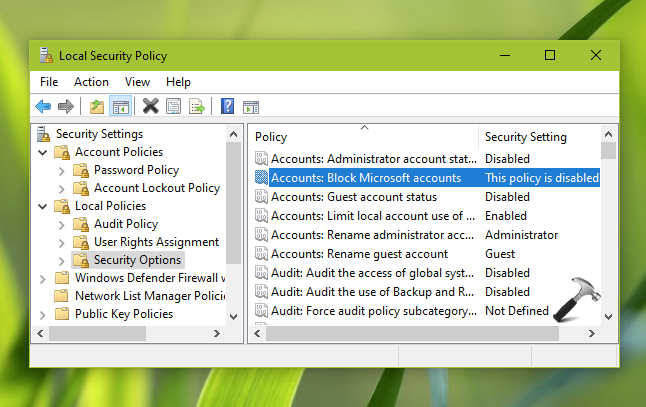 3.Győződjön meg arról, hogy aFiókok: Block Microsoft FiókokA házirend -beállítást úgy állítják be, hogy ez a politika fogyatékos állapot. Zárja be a biztonsági házirendet, és próbálja meg váltani a helyi fiókra.