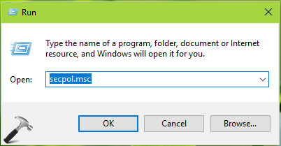 + Rés megfogalmaz secpol.msc-benFutpárbeszédpanel. KattintásRENDBENA biztonsági politika megnyitásához.