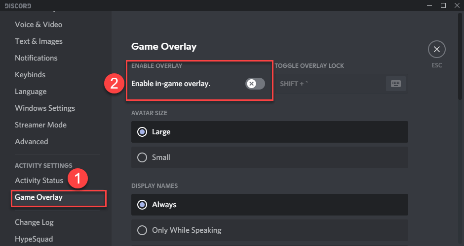 2. lépés:KikapcsolEngedélyezze a játékon belüli overlay-tMiután a bal oldali menüből kiválasztotta a játékfedelet.