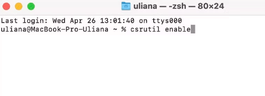 6. lépés:Miután a Mac újraindul, a SIP-t le kell tiltani. Állapotát a Terminál megnyitásával és a parancs beírásával ellenőrizheti: csrutil enable
