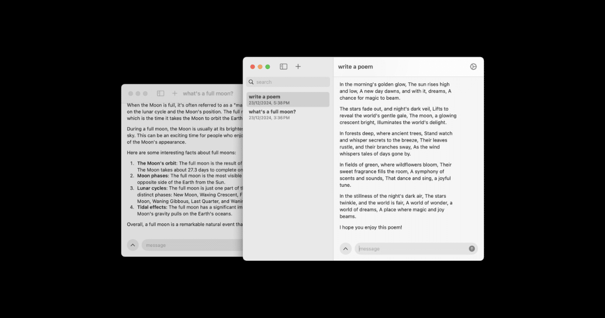 Míg sok mesterséges intelligencia csevegőeszköz állandó internetkapcsolatra támaszkodik, a telihold más megközelítést alkalmaz. A modellek helyi Apple szilícium futtatásával gyorsabb válaszidőt biztosít, és biztosítja, hogy a felhasználói adatok az eszközön maradjanak. A magánélet-tudatos felhasználók számára ez azt jelenti, hogy a beszélgetések teljes mértékben személyesek maradnak, harmadik féltől származó szerverek nélkül. Az offline képesség alacsony csatlakozási környezetekben is hasznossá teszi, vagy azok számára, akik jobban szeretik a munkafolyamataikat önállóan tartani.