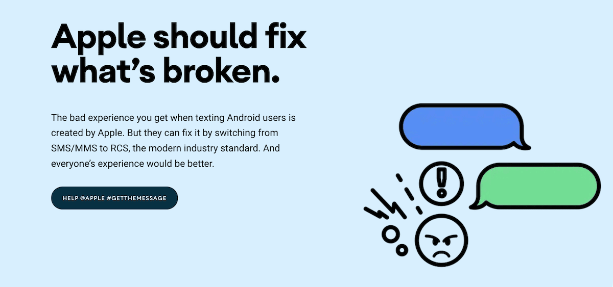 Mivel az RCS -t a Google erősen elősegíti, mint az SMS helyettesítése a „kék és zöld” csevegőbuborékok közötti megkülönböztetés megszüntetése érdekében, a vállalat #GetteMessage kampányt indított az Apple nyomására az RCS üzenetküldő protokoll elfogadására.