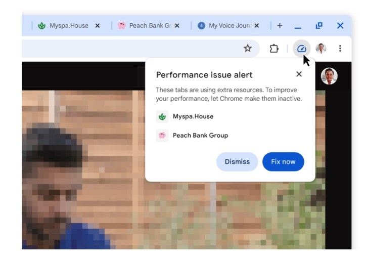 Ha engedélyezve van, a szolgáltatás értesítést jelenít meg, technikailag csak egy jelvény, amely hasonlít a teljesítmény ikonra (kilométer -számláló). Az ikon megjelenik az eszköztáron, a profilképe mellett. A rá kattintás egy figyelmeztetést jelenít meg, hogy egyes lapok extra erőforrásokat használnak, és hogy a króm a fülek inaktívvá tételével javíthatja a problémát. Más szavakkal, megmutatja azokat a füleket, amelyek lelassítják a krómot, és felajánlják, hogy a memória -megtakarító funkcióval aludjanak. Ezt manuálisan megteheti, az erőforrás-igényes lapok megfigyelésével a Chrome feladatkezelőjével. De ez valószínűleg egy kicsit fejlett eszköz, amelyet az átlagos felhasználók nem tudnak, hogyan kell használni, tehát a teljesítmény -kiadás riasztásai hasznosak lehetnek számukra. Inkább az Auto Tab Dobard Extension használatával használom (Firefox/Króm) A fülek felfüggesztéséhez.
