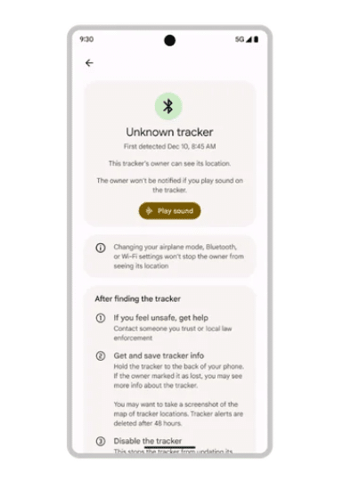 A legújabb frissítéssel felszerelt Android-eszközök mostantól értesítik a felhasználókat, ha „egy ismeretlen Bluetooth-követő elválik a tulajdonosától, és elhatározta, hogy veled utazik”. Ez az értesítés felhívja a figyelmet az esetleges jogosulatlan nyomon követésre, és biztosítja, hogy a felhasználók tájékozottak maradjanak a környezetükről. TólGoogle: