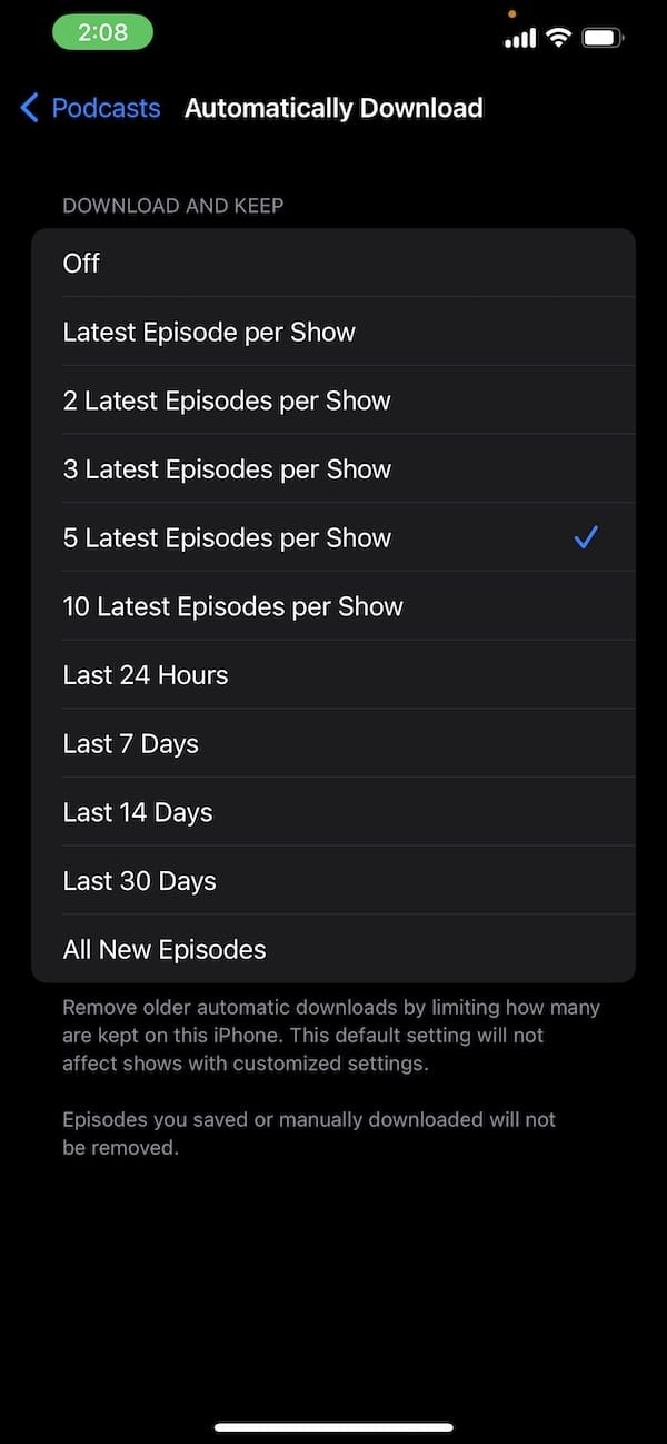 Az Apple hozzáadott egy új „automatikus letöltés” funkciót, amely lehetővé teszi a felhasználók számára, hogy konfigurálják a „letöltés és tartás” lehetőséget a podcastok számához, amelyet automatikusan letölthetnek iPhone -ra vagy iPadre. A régebbi podcastokat a kiválasztott opció alapján automatikusan törlik. Ez a beállítás megváltoztatható a Beállítások> Podcast -os oldalra, és hasznos a korlátozott tárolóhelyekkel rendelkező felhasználók számára.