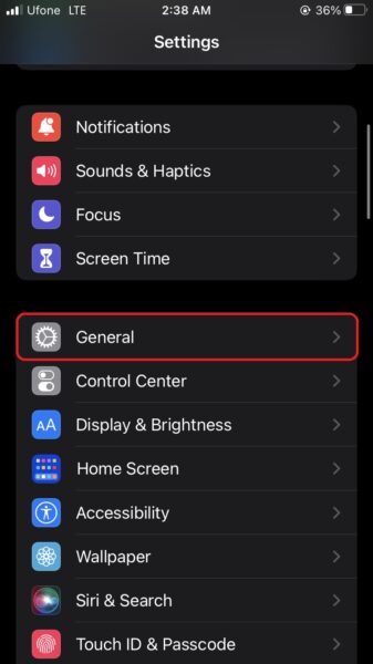 - A Beállítások alkalmazásban görgessen le, és érintse meg a lehetőségetÁltalános.