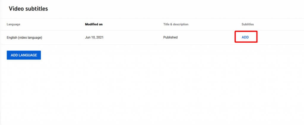 - Ha még nem tette meg, válassza ki a videó nyelvet. Ezután kattintson a kékreHozzáadgomb a feliratok alatt.