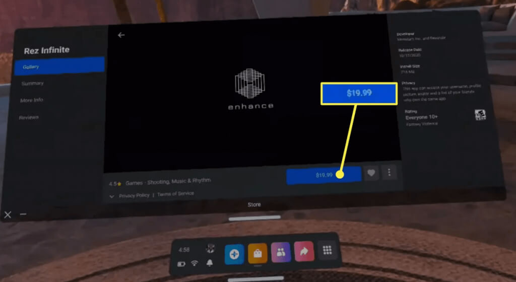 A legegyszerűbb módszer a játékba való belépéshez, ha megvásárolja azt az Oculus Quest fejhallgatón keresztül. A virtuális valóságon belüli üzlethelyiséghez hozzáférhet a jobb oldali tapadó-vezérlő Oculus gombjának megnyomásával. Csak nyissa meg az eszköztárat, és válassza ki az áruház ikont.