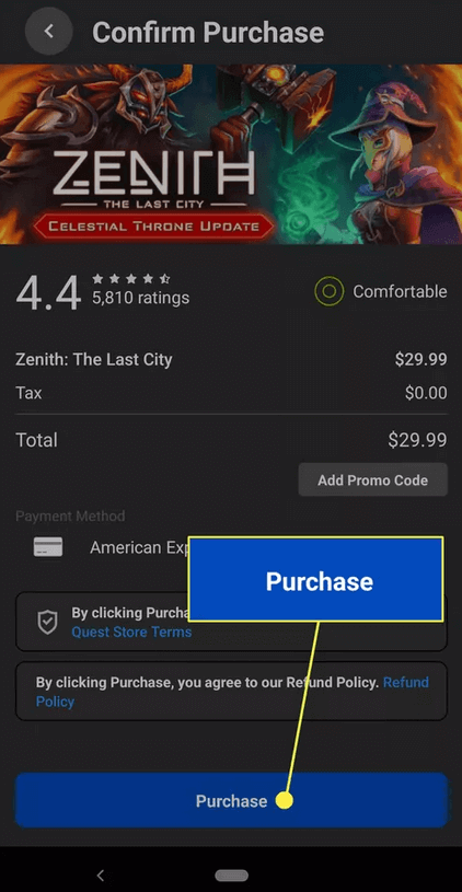 A mobilalkalmazás felszámítja az alapértelmezett fizetési módszert, csakúgy, mintha a VR -től vásárolna. Megtalálja az új játékot a Quest Library -ben, de ha a mobilalkalmazáson keresztül vásárolta meg a játékot, akkor azt az Oculus fejhallgatójába tölti le, amikor legközelebb bekapcsolja. Ez azt jelenti, hogy meg kell várnia, hogy a letöltés befejeződjön, mielőtt beugrhat és lejátszhat.