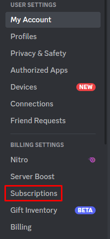 - Válassza ki aElőfizetésekfülre a felhasználói beállítások oldal bal oldali paneljén.