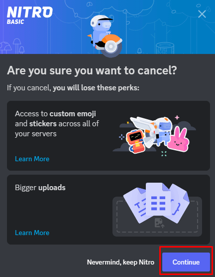 - Egy új ablak részletezi az összes Nitro-jutalmat, amelyet elveszít, ha lemond az előfizetésről, mint például a matricák, a képernyőmegosztás, a HD-videohívások és még sok más. Görgessen végig ebben az ablakban, amíg el nem éri az alját, és meg nem találja aFolytatásgomb.