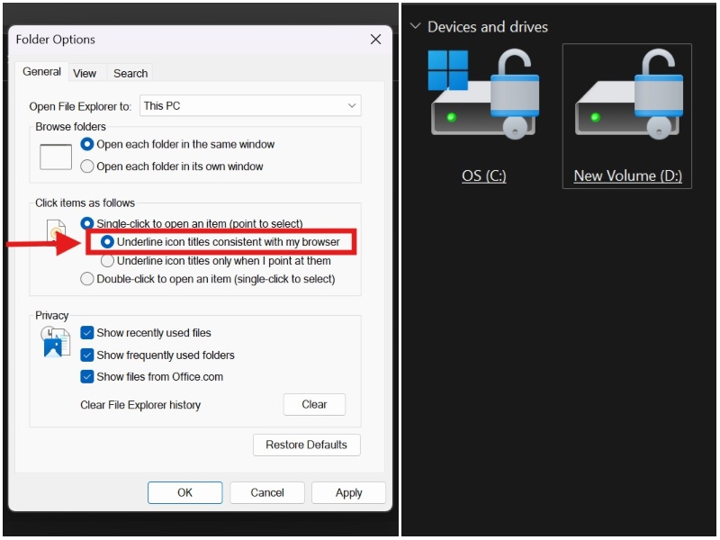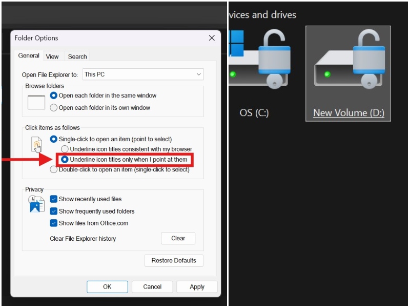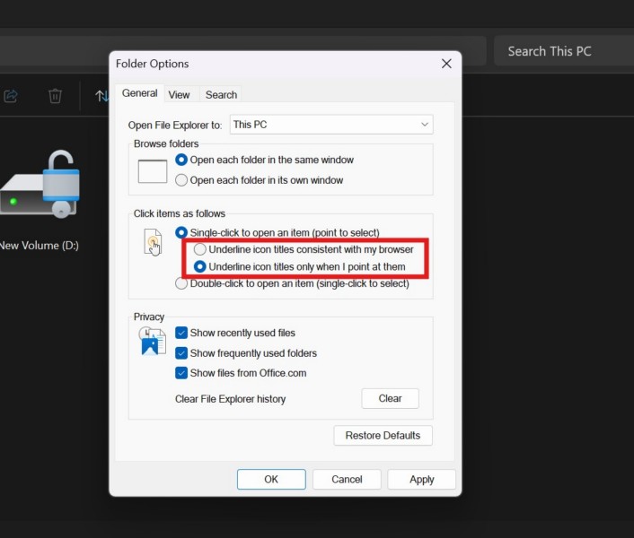 6.Most, az egyetlen kattintás alatt egy elem megnyitásához (pont a kiválasztáshoz), két al-beállítás van-Aláhúzott ikoncímek, összhangban a böngészőmmelésAláhúzza az ikoncímeket csak akkor, ha rámutatok rájuk- Alapértelmezés szerint:A második opciót választják ki-
