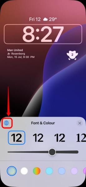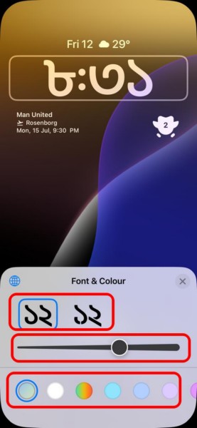 8.Miután beállította az órát az iPhone zár képernyőjén az óra kedvelt nyelvét, megtehetiTovábbi testreszabásAzáltal, hogy kiválasztja annakbetűtípus,vastagság, ésszínA betűtípus és a szín menüből.