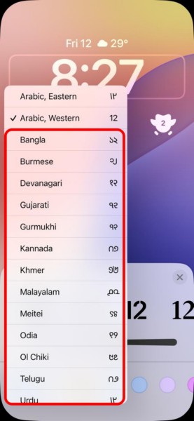 Ha meg szeretné változtatni az iPhone lezárási képernyőn megjelenő órájának nyelvét, írja be a Lock képernyő testreszabási módját, érintse meg az órát, érintse meg a Globe ikont a betűtípus és a szín menüben, és válassza ki a kívánt nyelvet a megadott beállítások közül. Ha a legújabb iOS 18 frissítést futtatja iPhone-ján, akkor lehetőségeket kap a különféle indiai-specifikus nyelvekre.