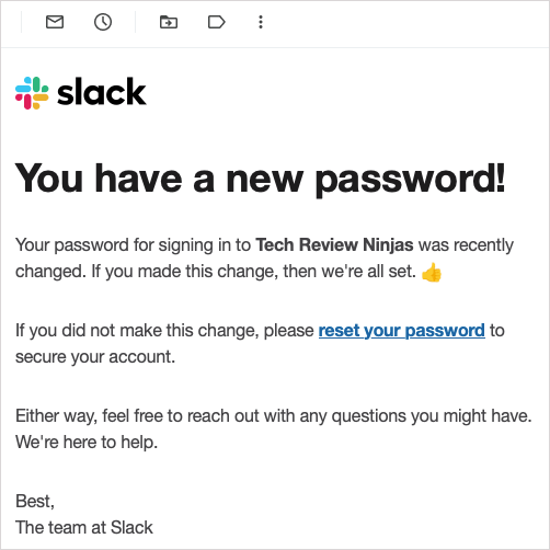 Ezután arra irányul, hogy megnyitja a Slack alkalmazást, vagy folytatja a Slack használatát a böngészőben. Azt is kapjon egy e -mailt, amely megerősíti, hogy új jelszót hozott létre.