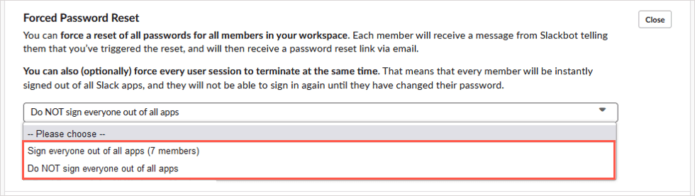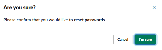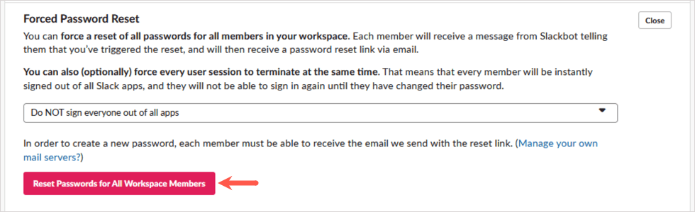 - Ne írjon alá mindenkit az összes alkalmazásból: Ez minden tagot bejelentkezik, de elküldi nekik egy Slackbot üzenetet, amelyet vissza szeretné állítani a jelszavát. Ezután e -mailt kapnak a Slack -től egy jelszó -visszaállítási link segítségével.