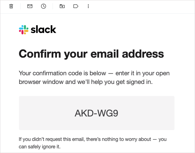 - Ellenőrizze a postafiókját, hogy kapjon -e e -mailt a Slack -től, amely egy megerősítő kódot tartalmaz. Ha nem látja az e -mailt, akkor ellenőrizze a spam vagy a szemét mappáját.