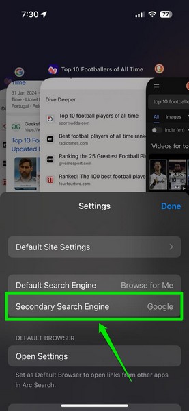 3.Amint beállítja a Browse for Me opciót alapértelmezett keresőmotorként az Arc Search alkalmazásban, egy újMásodlagos keresőmotor mezőa Beállítások oldalon. Az előző alapértelmezett keresőmotor automatikusan másodlagosként lesz beállítva.