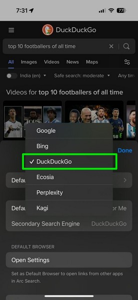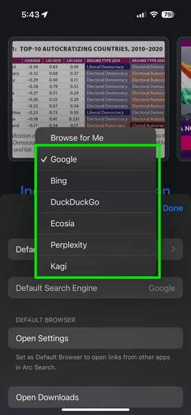 6.Itt,érintse meg a használni kívánt keresőtalapértelmezettként az iPhone Arc Search funkciójában a beállításhoz.