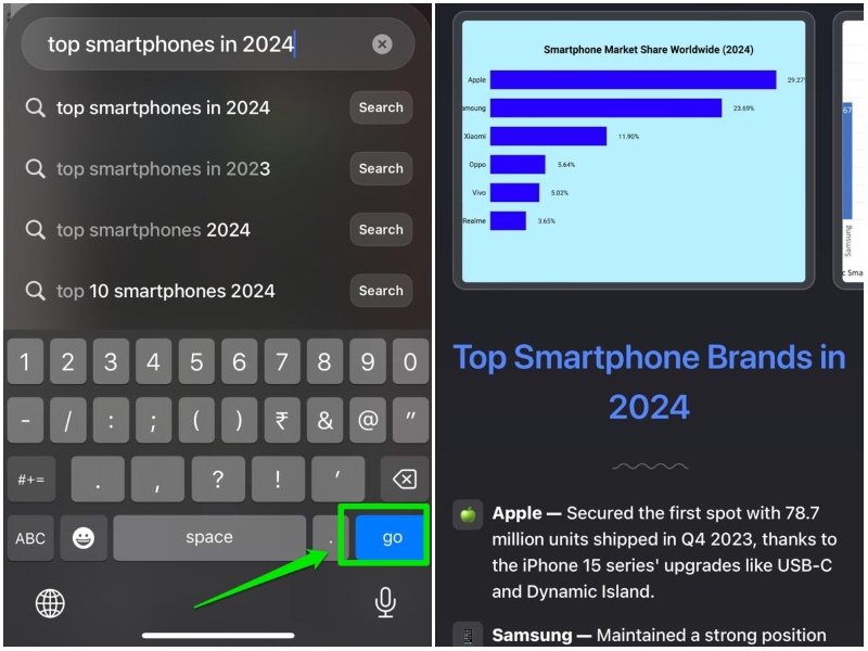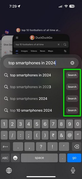 Ha azonban szeretné látni a keresési eredményeket a keresőben, megtehetiérintse meg a „Keresés” gombot a javasolt keresési lekérdezések mellett. Ezért be kell állítania egy másodlagos keresőtamikor a Browse for Me opció beállítása alapértelmezettkéntaz iPhone Arc Search böngészőjében.