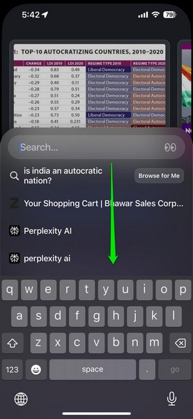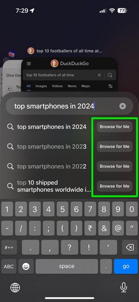 Ha beállít egy elsődleges keresőmotort az iPhone Arc Search böngészőjében, és a keresősáv segítségével keres egy lekérdezést, az a következő oldalon jeleníti meg a tényleges keresési eredményeket. Ez az, amikor megnyomja a gombot„Tallózás nekem” gombminden javasolt keresési lekérdezés mellett, hogy a böngésző AI által generált, egyéni oldalt hoz létre a lekérdezéshez, igaz?