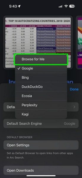 Érdemes megjegyezni, hogy a hagyományos keresőmotorokon kívül a „Browse for Me”-t is beállíthatja alapértelmezett keresőként az Arc Search alkalmazásban iPhone-ján. Van azonban ebben egy bökkenő, amelyet rövidesen elmagyarázok.