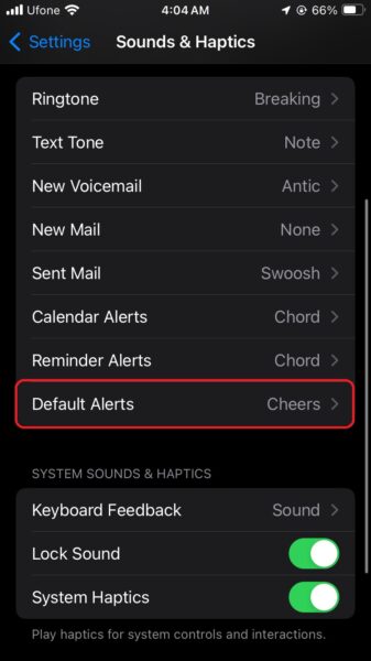- A Hangok és tapintások alatt érintse meg a gombotAlapértelmezett figyelmeztetések.