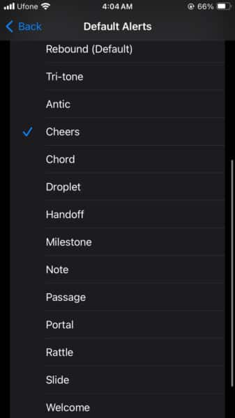 - Megjelenik a figyelmeztető hangok listája. Válassza ki azt, amelyet alapértelmezett értesítési hangként szeretne beállítani. Nyugodtan fedezze fel a különböző hangszíneket, amíg meg nem találja az igényeinek megfelelőt.