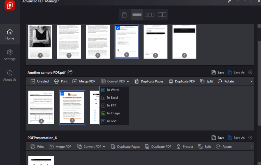 Az Advanced PDF Manager lehetővé teszi, hogy egy PDF -et népszerű fájlformátumokká konvertáljon Word, Excel, PPT, Image és Text segítségével.