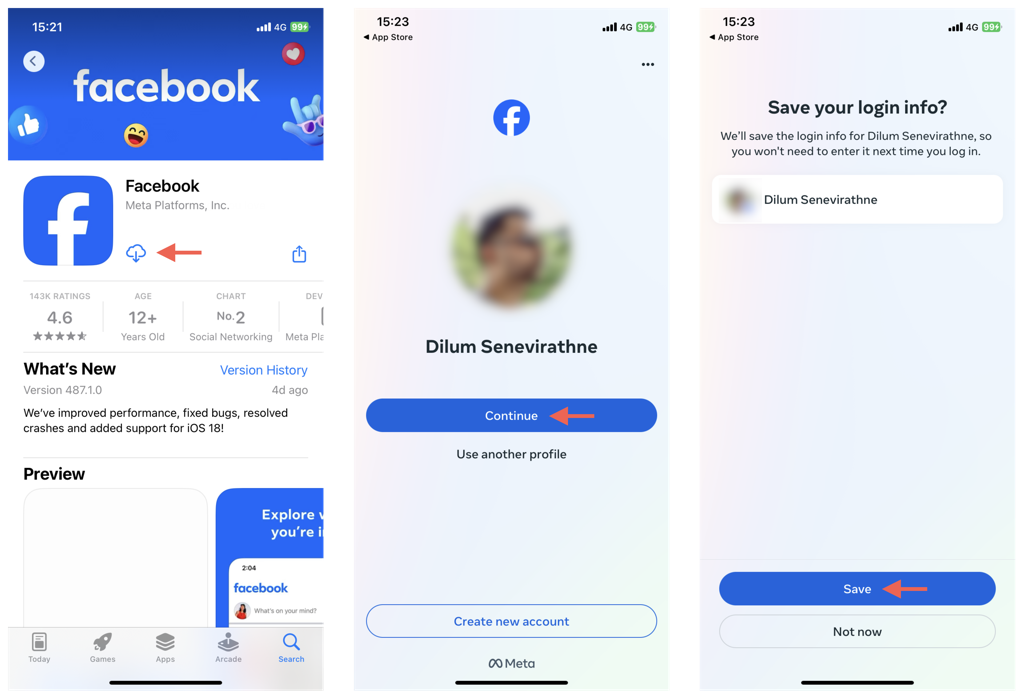 - Válassza ki a metafiókját, és koppintsonFolytatódik- Ha nem látja a fiókválasztási képernyőt, jelentkezzen be manuálisan, de válassza kiMegtakarításaMentse be a bejelentkezési adatait?Képernyő, hogy elkerülje a beiratkozást a kézi bejelentkezéskor, amikor legközelebb eltávolítja és újratelepítse az alkalmazást.