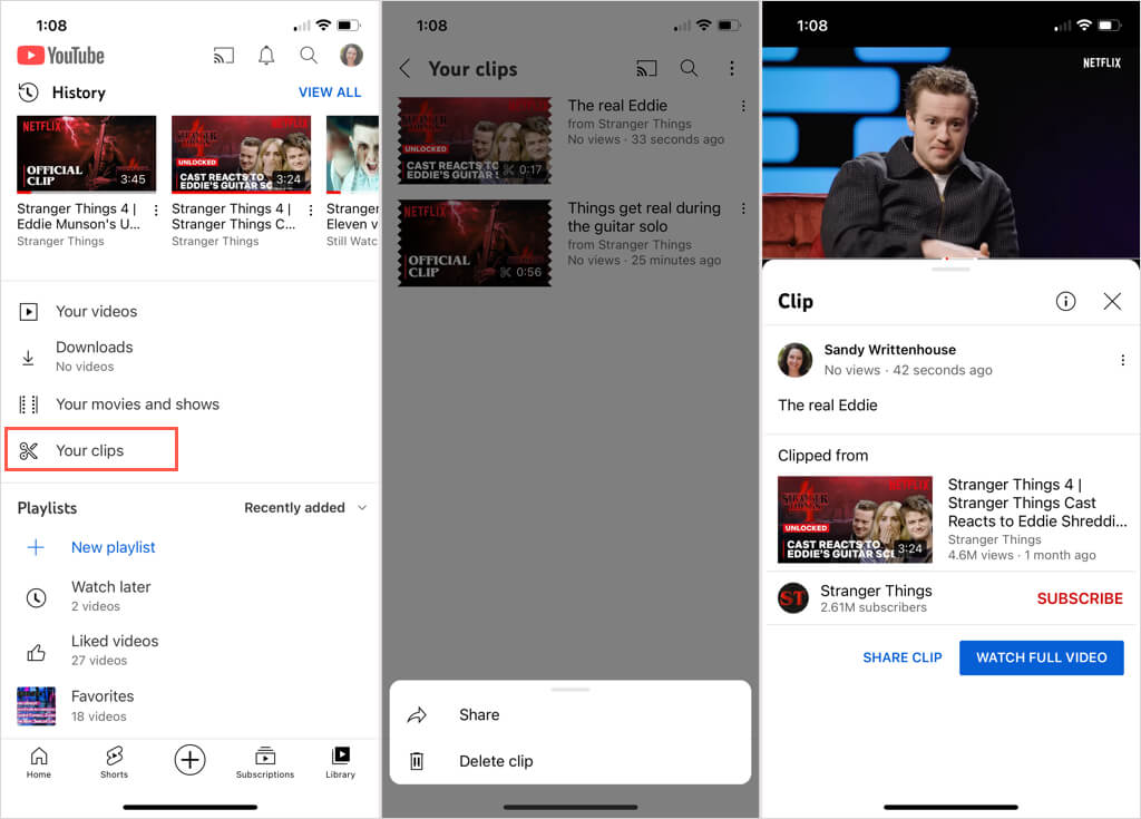 A videoklipek megtekintéséhez a mobil alkalmazásban lépjen aKönyvtártabra és válasszonA klipek- Érintse meg ahárom pontegy klip mellett, hogy megosszák vagy töröljék. Alternatív megoldásként válasszon egy klipet a kinyitáshoz, majd megnézze, megossza vagy nyissa meg a teljes videót.