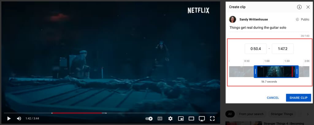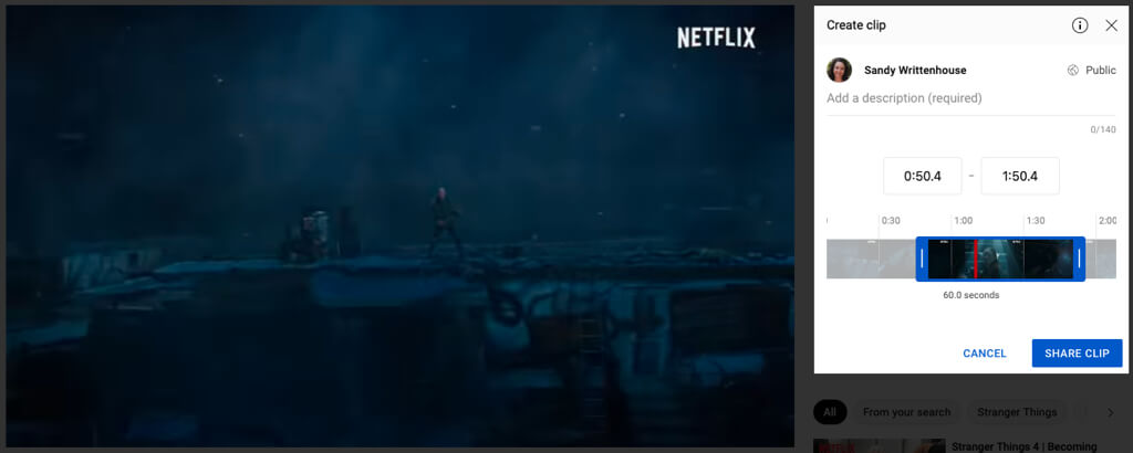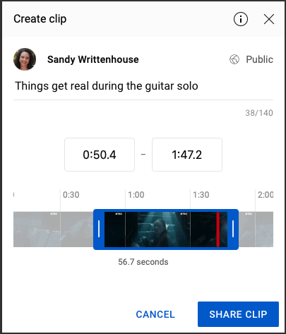 A klip elkészítéséhez be kell jelentkeznie a YouTube -fiókjával. Miután létrehozta a klipet,nyilvános- Megjelenhet „a Select Search, Discovery és Analytics felületeken”. Ez azt jelenti, hogy a klipjét bárki láthatja, aki hozzáféréssel rendelkezik az eredeti videóval együtt. Az eredeti videó készítője a klipet is megnézheti.