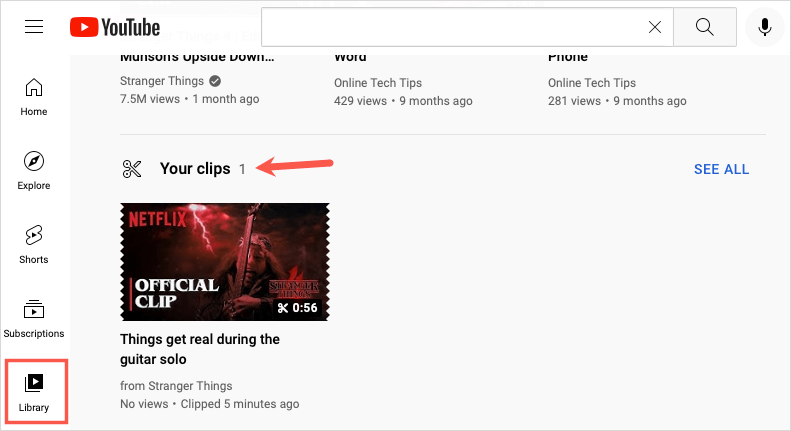 A létrehozott klipek megtekintéséhez válassza kiKönyvtárA bal oldali menüben. Görgessen le a jobb oldalon aA klipekszakasz.
