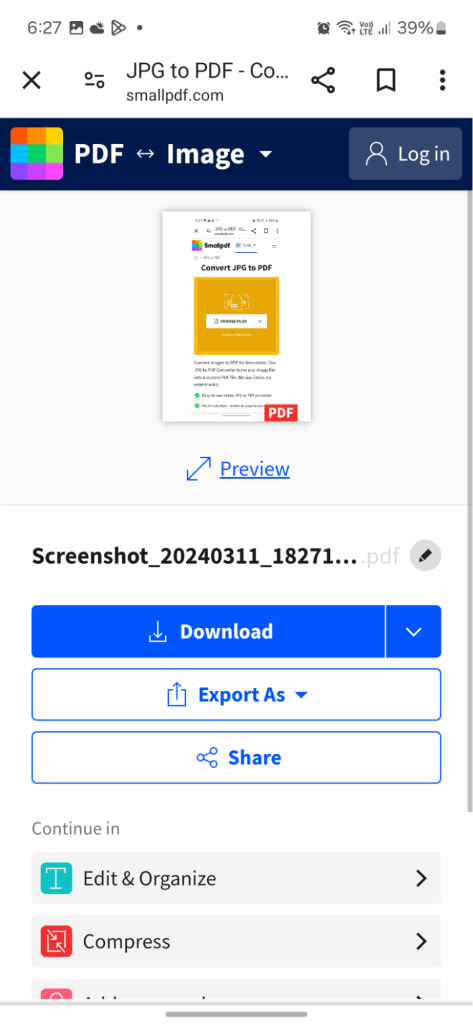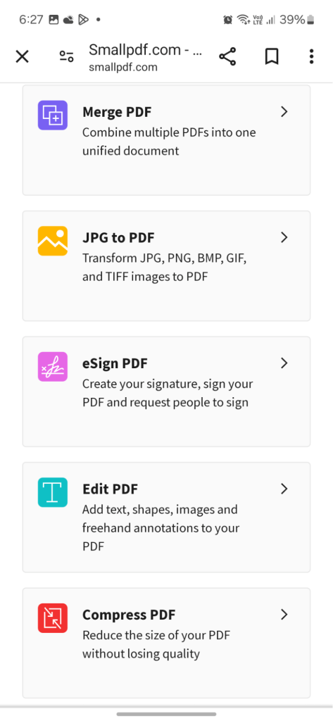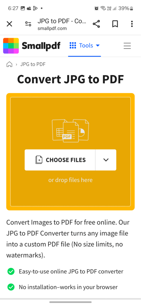 Azok számára, akik szeretnék elkerülni a további alkalmazások telepítésének nehézségeit Android-eszközeikre, a képek PDF formátumba alakítása továbbra is gyerekjáték az online konverterekkel. Írja be a SmallPDF-et, amely egy jól ismert választás az online eszközök között, amely leegyszerűsíti a képek zökkenőmentes PDF-formátumba konvertálását Android-eszközén.